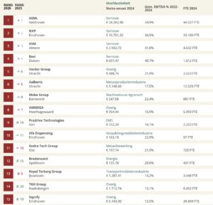 De top van de ranglijst wordt dit jaar gedomineerd door ondernemingen uit de halfgeleiderindustrie. Absolute koplopers zijn onder meer ASML, NXP Semiconductors, ASM International en BE Semiconductor Industries. Hun positie onderstreept het strategische belang van lithografie, chipontwerp en front-end productietechnologie binnen mondiale waardeketens.