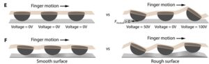 Bij een hogere spanning is de adhesiekracht groter en daardoor is de weerstand tussen je vinger en het scherm ook groter. Hierdoor drukken de noppen krachtiger in je huid, wat een ruw oppervlak simuleert. Bij lagere spanning is er juist minder weerstand waardoor het oppervlak gladder voelt.