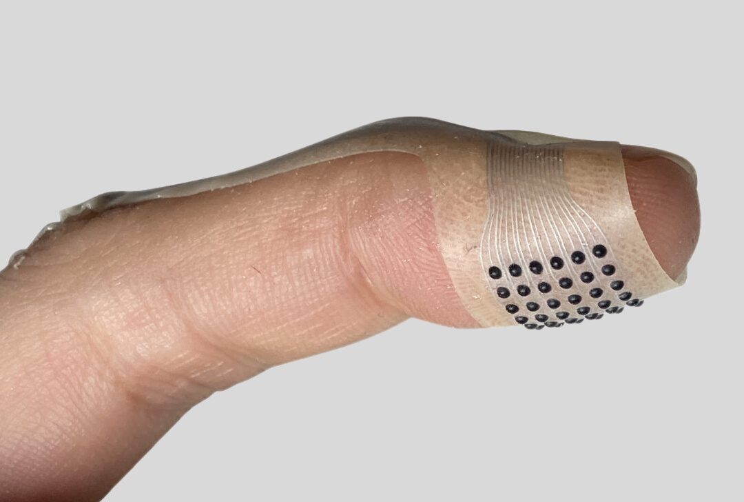 Als je een nieuwe trui koopt en eerst even de stof wilt voelen, moet je naar een fysieke winkel. Dit gaat niet online. Daar komt wellicht verandering in. Wetenschappers van de Northwestern University hebben een soort pleister ontwikkeld die je om je vinger bindt en waarmee je texturen kunt voelen op touchscreens. Een artikel hierover is gepubliceerd in Science Advances.