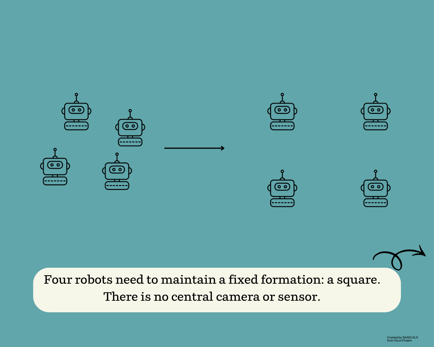 Dat principe geldt ook voor robots. Maar zodra meerdere robots moeten samenwerken, wordt het een stuk ingewikkelder. Stel je vier robots voor die in een vierkant moeten bewegen en onderling dezelfde afstand moeten houden. Zonder centrale coördinatie meten ze elk hun eigen positie ten opzichte van de anderen. Het risico? Een eindeloze correctielus, waarin elke aanpassing weer nieuwe reacties uitlokt—zonder ooit tot een stabiele formatie te komen.