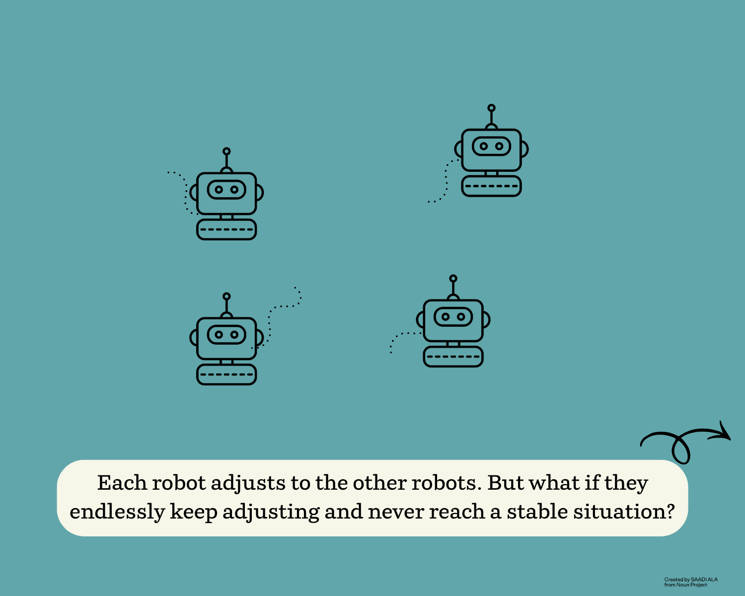 Elke robot heeft dus zijn eigen waarneming en moet op basis daarvan zelf reageren op de anderen – een stukje naar voren, een stukje naar achteren, iets naar links… maar die andere reageren ook weer op hem (of haar). En dan kan het maar zo gebeuren dat ze nooit tot een stabiele situatie komen, bijvoorbeeld omdat ze door kleine meetfoutjes maar blijven corrigeren.
