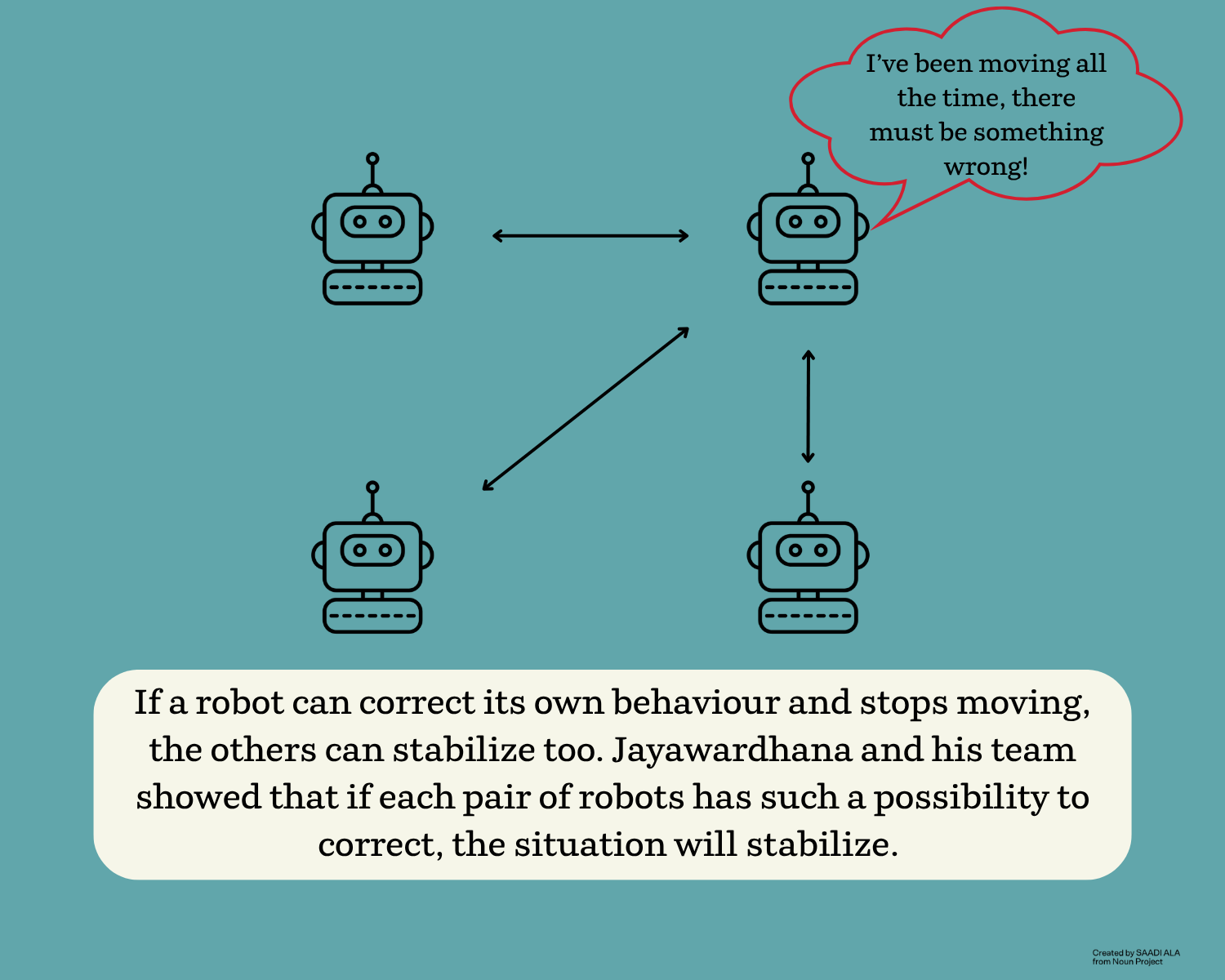 Tien jaar geleden losten Jayawardhana en zijn team het probleem op: met behulp van een zogenaamde estimator kan een robot zijn eigen gedrag corrigeren. Een robot die steeds minimale correcties blijft maken zal dan uiteindelijk stilstaan. ‘Dat is geen beslissing die zo’n robot neemt hoor,’ licht Jayawardhana toe. ‘Het is een ingeprogrammeerde actie.’ Jayawardhana bewees dat wanneer in elk paar van robots dat afstand tot elkaar moet houden er één met een estimator is, de situatie zal stabiliseren.