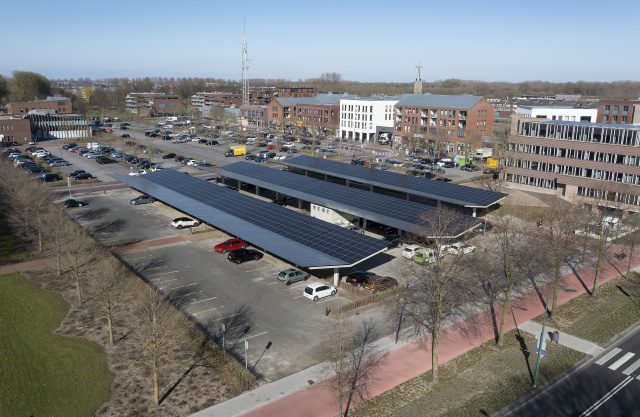 Een parkeerterrein met zonnepanelen waarbij hernieuwbare energieopwekking , elektrisch laden en energieopslag slim zijn…