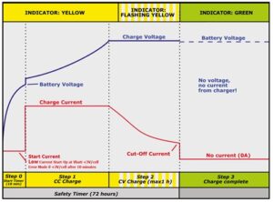 Fase 1 – opladen met constante stroom: als de oplader op de netvoeding is aangesloten en er een batterij op de uitgang wordt aangesloten, wordt automatisch een laadcyclus gestart. De oplader functioneert in deze fase in constantestroommodus (‘constant current’ of CC) en levert de maximale nominale stroom. Tijdens dit proces licht de ledindicator van de oplader geel op. De batterij wordt in deze stap snel opgeladen en bereikt meestal 80 tot 95% van zijn capaciteit.